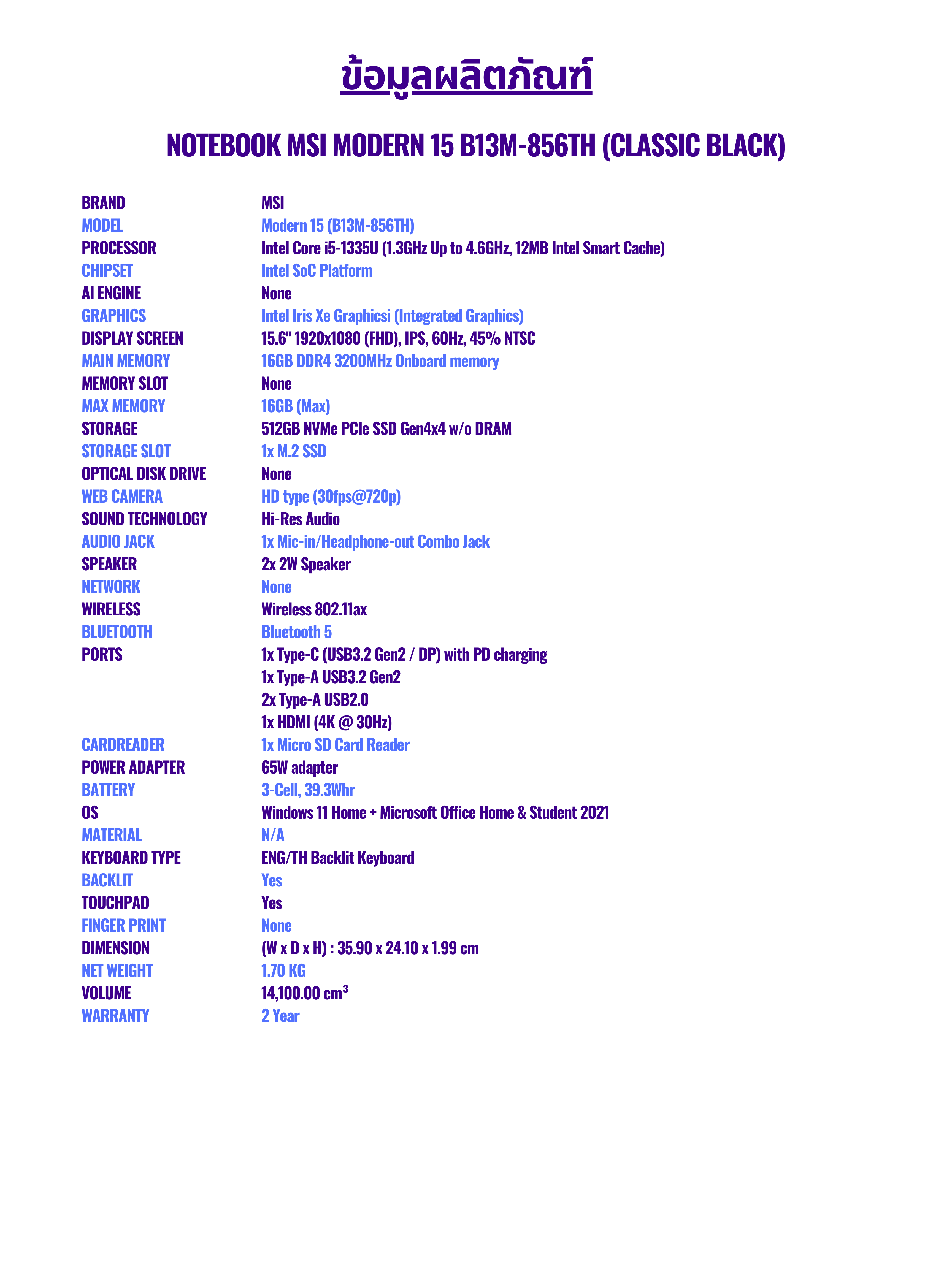 Notebook MSI Modern 15 B13M-856TH (Classic Black)