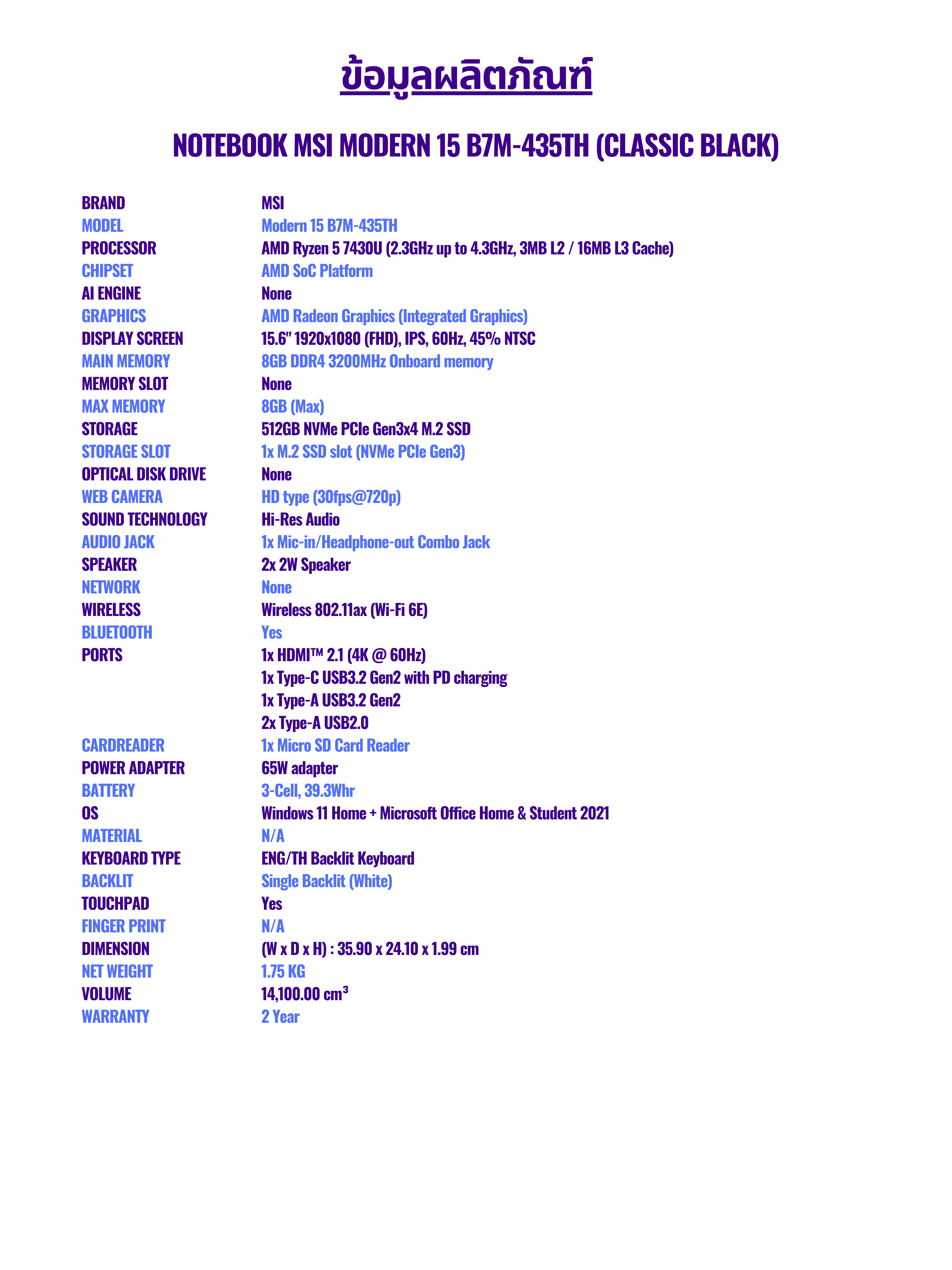 Notebook MSI Modern 15 B7M-435TH (Classic Black)